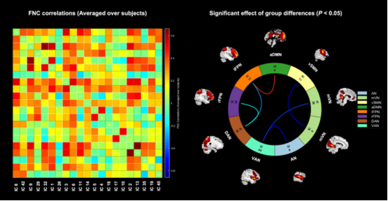 图3 SSc患者与健康志愿者的网络间功能连接差异