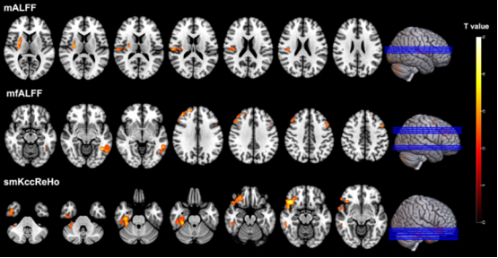 图2 SSc 患者与健康志愿者的脑功能低频振荡振幅(ALFF)和局部一致性(ReHo)差异(t 值分布)