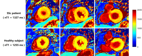 图1:SSc患者和健康受试者在CMR中测量的心肌nativeT1值。一名50岁SSc患者,DLCO下降(54%),心肌native T1升高(1327ms)。同时,图像(下图)显示了50岁健康受试者的心肌的nativeT1图,平均T1值为1255ms。心肌T1图的MR图像从左心室的短轴位扫描获得。nT1,nativeT1值。