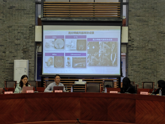 .在他的汇报中,重点阐述了新型高分辨磁共振斑块成像系统开发任务,产品优点以及对关键指标提升,产品在多家三甲医院开展临床应用研究入组病例情况及产品安装在多个三甲医院及用户使用报告,产品销售情况以及完成任务书要求的国内发明专利两项,软件著作权四个,产品获得一项 NMP注册证情况。