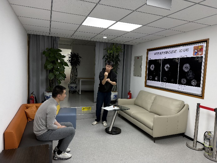 随后,影像中心的老师们向大家讲述了磁共振安全准则,进行进入磁共振扫描间的准备工作。在老师的提示下,大家将手机、磁卡、钥匙以及身上的金属物品放在指定的位置,由老师一一检查,进入了磁共振扫描间。
