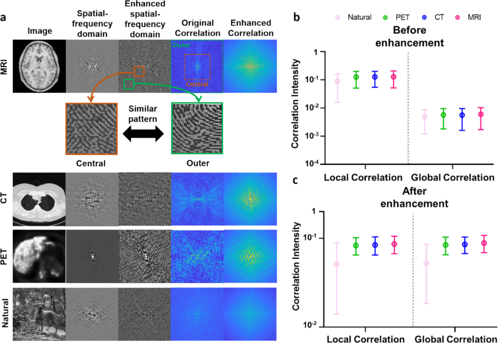 团队提出的DCNUFFT方法首次引入空间-频率域的全局相关性先验,突破了传统NUFFT仅关注局部频率邻近关系的假设,能够更有效地恢复k空间中高频信息,从而可以生成结构更清晰、细节更丰富的图像。研究使用相关性函数量化空间-频率数据的相关强度(见图1),并通过相关性图展示了数据间在不同“相关距离”下的局部与全局相关特征,并通过幂函数增强频率数据的全局相关性。
