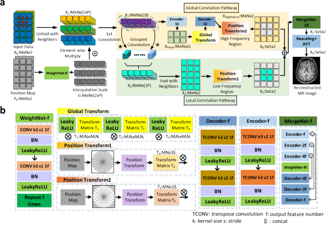 DCNUFFT的流程图见图2,团队将深度卷积神经网络融合至非均匀傅里叶变换NUFFT流程中,大幅提升了稀疏采样条件下的磁共振图像重建质量。DCNUFFT包含三个关键模块:重排序模块(Reordering Block)引入全新的k空间数据标准化方式,使网络可适配多种采样轨迹而无需更改结构;重标定模块(Rescaling Block)通过幂函数增强空间-频率域中的局部与全局关联;重建模块(Restoration Block)则使用可学习的网络层自适应完成插值与密度补偿,并结合局部与全局路径联合恢复图像中的低频与高频信息。该方法用可训练神经网络替代传统NUFFT中的插值核和密度补偿步骤,并引入全局空间-频率域先验,有效增强了高频信息的恢复能力。