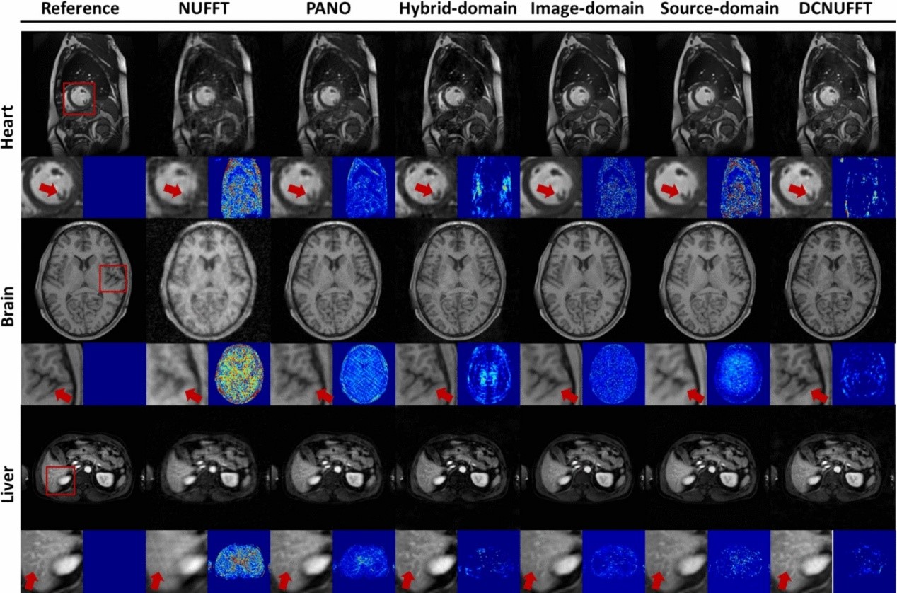 在心脏、大脑和肝脏的MRI数据上进行的回顾性重建实验中(采样率R=4),DCNUFFT展现出卓越性能。如图3所示,传统反NUFFT方法产生明显伪影与高噪声;基于Patch的迭代重建方法(PANO)及图像域神经网络虽能缓解伪影,但在细节恢复方面表现欠佳,PANO误差更为显著;MoDL和VN结合压缩感知与深度学习技术,略优于PANO;频率域中的Hybrid与Source-Domain方法则在细节恢复上有所提升,但仍存在较高噪声。而DCNUFFT通过联合挖掘局部与全局频率相关性,充分利用低频与高频信息,在图像对比度与细节呈现方面实现显著优势,清晰展现出心脏乳头肌、大脑脑沟及肝脏血管等结构。