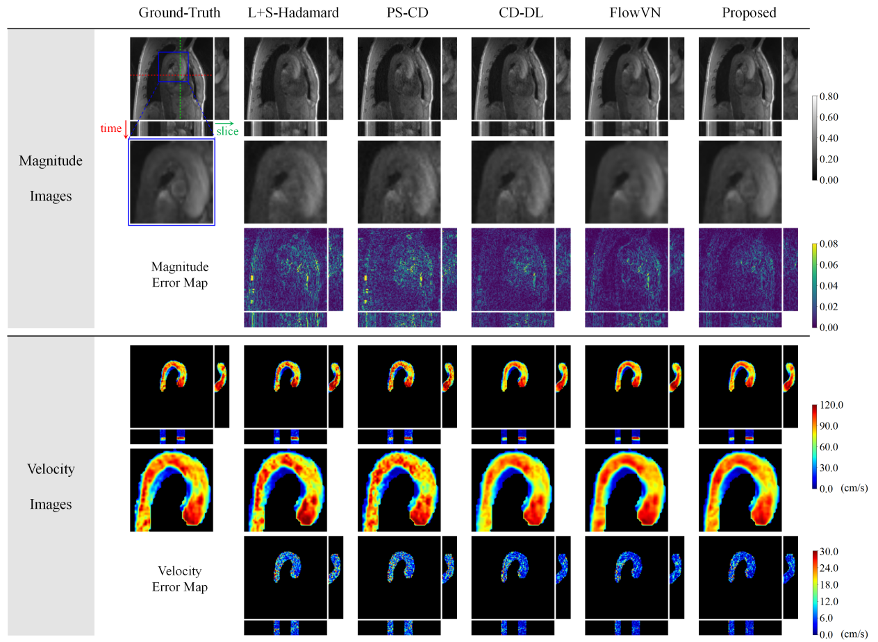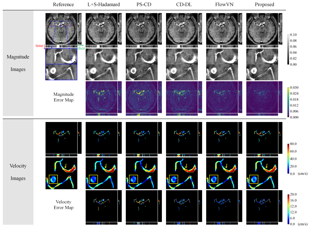对比方法:L+S-Hadamard(基于L+S的低秩-稀疏传统算法),PS-CD(基于部分可分离模型以及复数差稀疏性的传统算法),CD-DL(模值图和复数残差分别独立学习的深度学习算法),FlowVN(基于迭代展开变分网络的深度学习算法)。