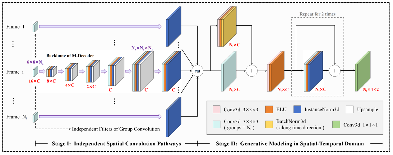 本研究试图从自监督学习的路径出发,解决上述难题。本研究首先从计算机视觉中的深度图像先验出发,通过利用卷积神经网络本身的归纳偏置来提供图像上的视觉先验。其次,由于4D-flow MRI数据量庞大、信息丰富,对于生成器的表达能力提出了挑战;为此我们提出一种全新的基于部分独立结构的卷积解码生成器,通过在生成过程中对时域和空间域的特征进行部分的分离,能够有效地降低计算代价,并且提高模型效率以及生成性能。最后,我们将相位对比血流成像中独特的复数差稀疏性,创新性地融合进了自监督模型当中,构建了一个生成-稀疏联合约束的重建模型,并导出了一种基于ADMM的迭代算法对该模型进行求解。该算法主要分为两个步骤,其一是对生成器进行预训练;其二是利用预训练的生成器作为算法初始化解,通过生成-稀疏联合迭代算法进一步增强图像质量。