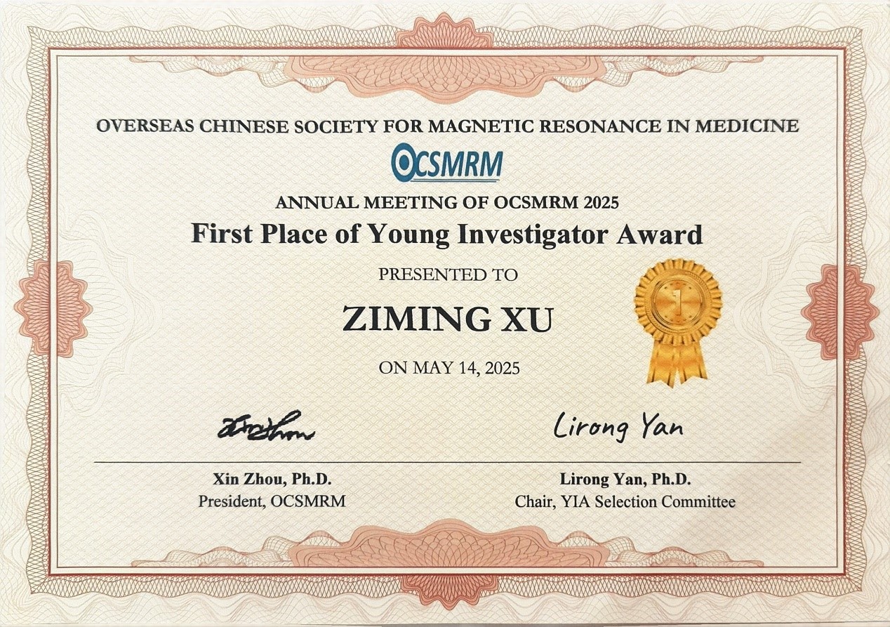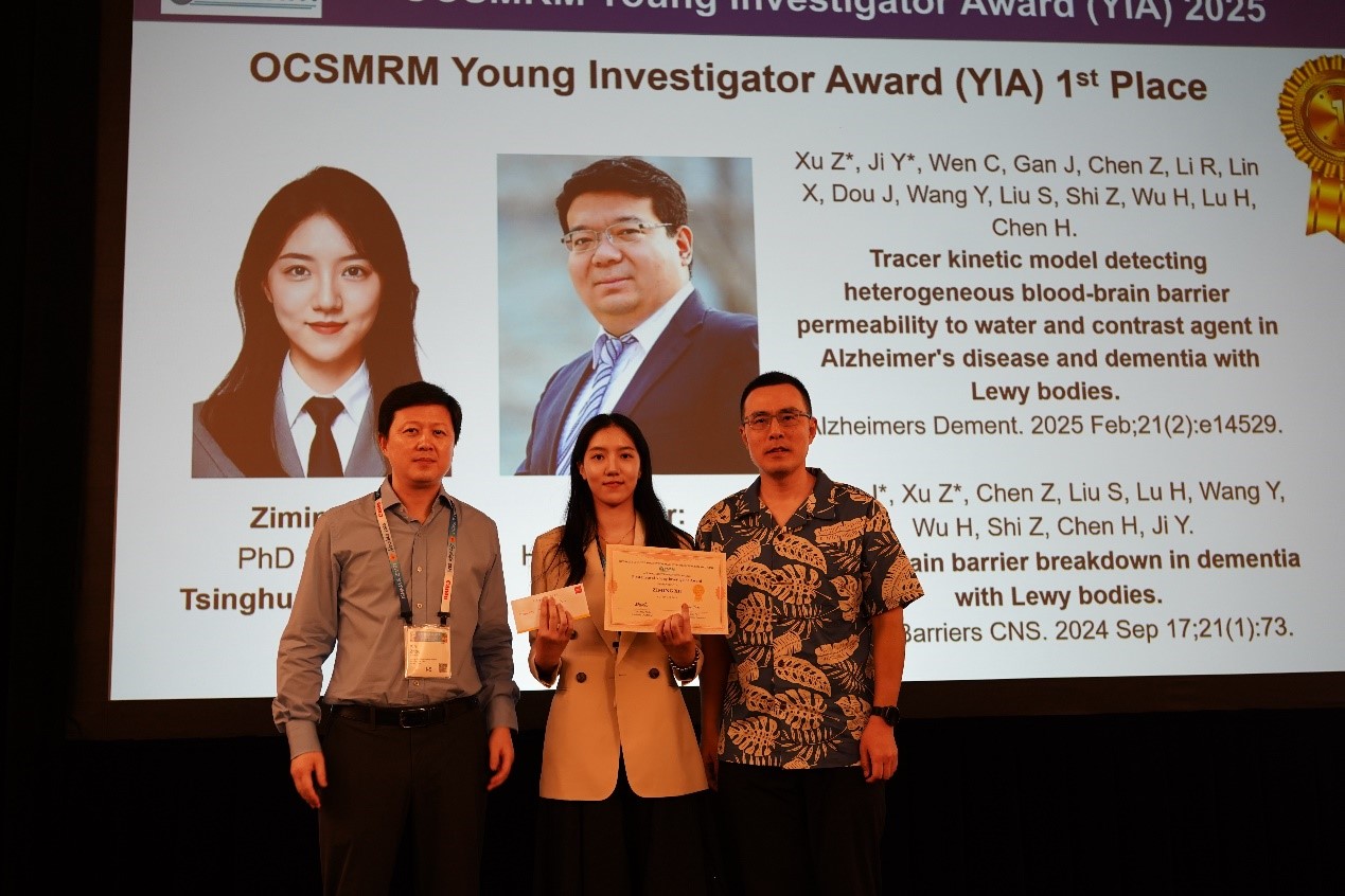 徐子茗同学的主要研究方向为量化脑屏障功能的磁共振成像技术及药代动力学模型研究,目前以共同第一作者在Alzheimer’s & Dementia,European Radiology,Fluids and Barriers of CNS等期刊发表SCI论文4篇,以第一作者在ISMRM会议和SMRA会议发表摘要10篇(其中口头报告7篇)。其提出的同时量化血-脑屏障对造影剂分子和水分子的药代动力学模型,揭示了阿尔茨海默症和路易体痴呆患者中血-脑屏障功能障碍的不同模式,为神经退行性痴呆患者的评估提供了有价值的潜在影像标志物,有较高的临床应用潜力。因其在量化脑屏障功能的磁共振技术研究上的贡献和成果,徐子茗同学于2025年获得海外华人医学磁共振学会(Overseas Chinese Society for Magnetic Resonance in Medicine,OCSMRM)青年研究员奖(Young Investigator Awards, YIA)第一名。