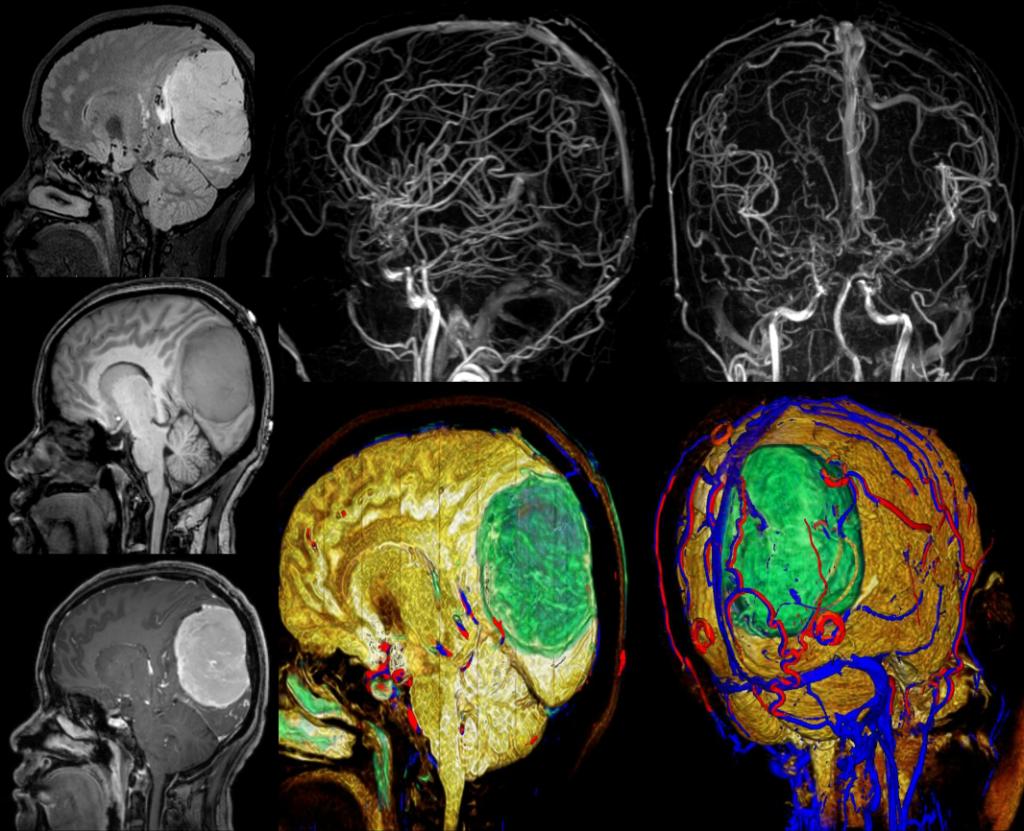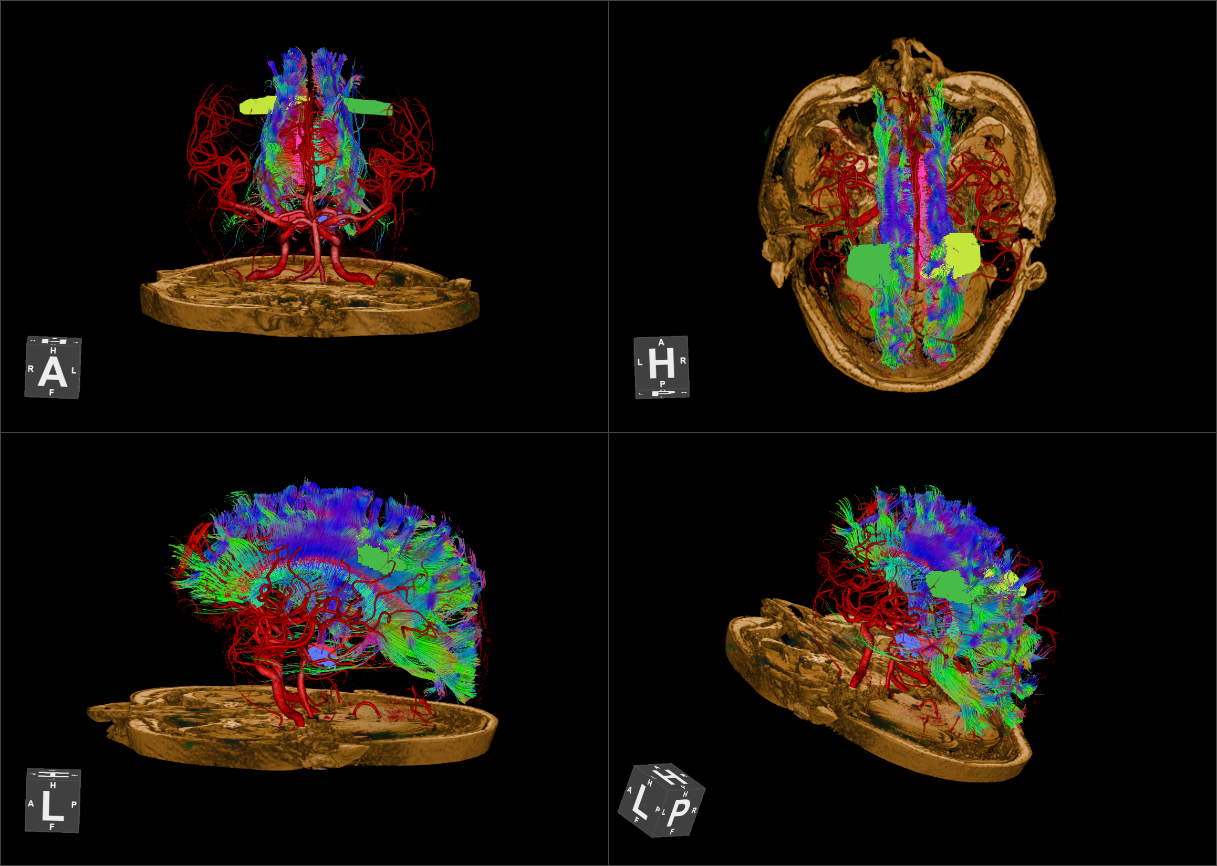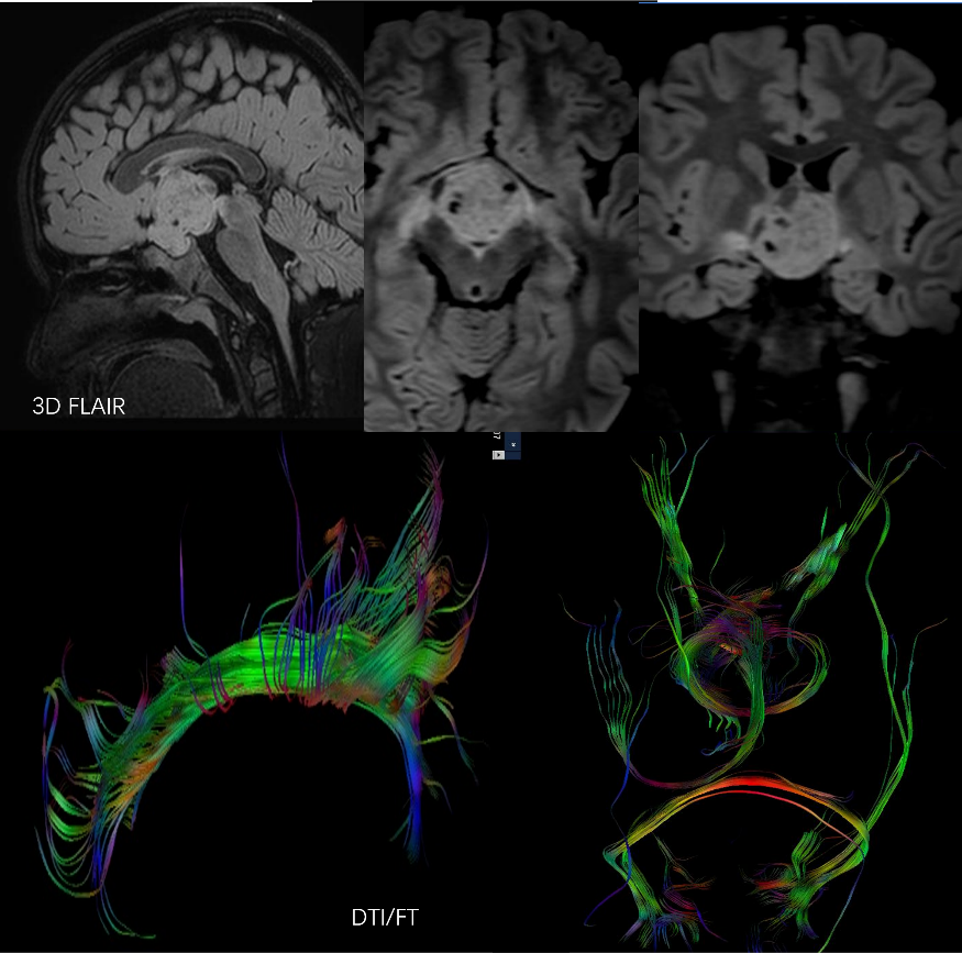 | 脑膜瘤患者,手术前计划,通过高分辨脑表面血管与瘤体病变,脑整体结构融合,获得明确定位表征信息。 | 脑中线视神经乳头胶质瘤,高分辨脑神经系统3D FLAIR成像技术显示视神经乳头胶质瘤的空间三维特征,DTI及纤维示踪后处理技术显示与手术入路相关穹隆及视路神经纤维束走行及特征。 |