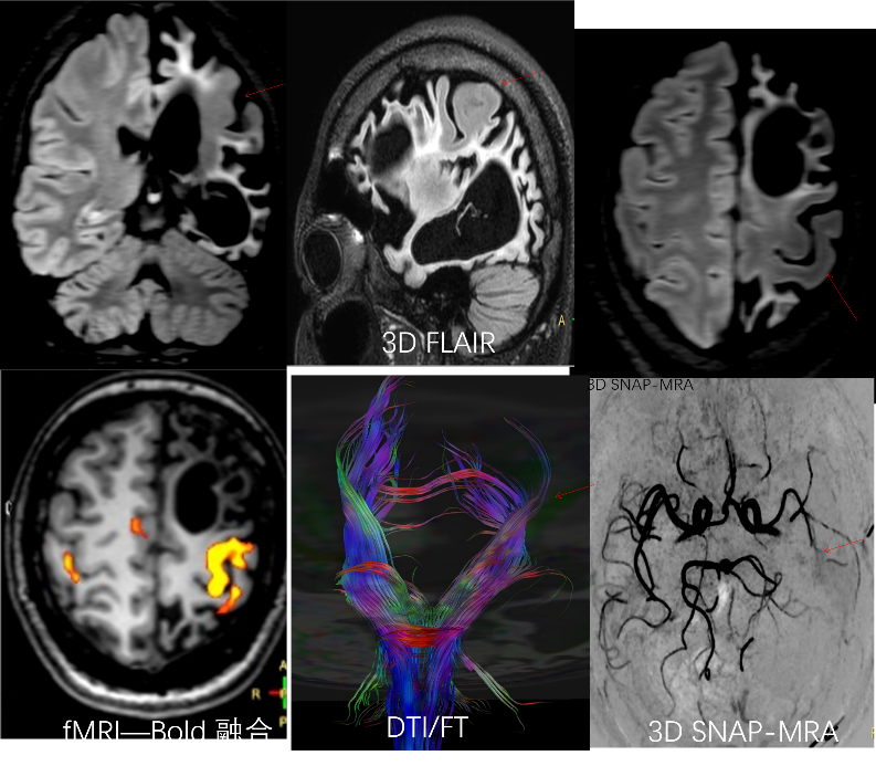 | 高分辨脑神经系统3D FLAIR成像技术显示局灶性皮质结构发育不良 | 高分辨脑神经系统mult-shot DWI 与传统single-shot成像技术对比,在脑灰质异位与急性脑皮质梗塞显示中更具优势。 | 3D SNAP-MRA 显示左大脑中动脉血管中断,3D FLAIR显示左脑萎缩及有功能的左手功能区,fMRI-Bold融合清晰显示功能区,DTI/FT 显示有功能的皮质纤维束。 |