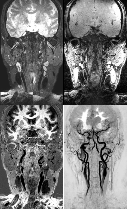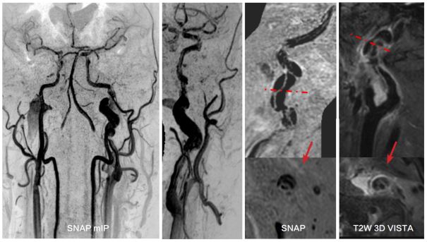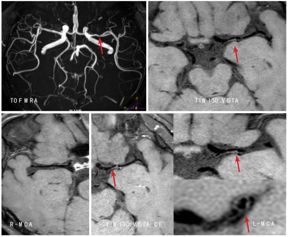 | 磁共振高分辨血管壁成像技术清晰显示左侧大脑中动脉 M1 段炎性增强及管腔狭窄 | 左侧颈内动脉路外段动脉夹层,可观察到真假腔、内膜片和周围炎性渗出 | 磁共振大范围高分辨血管壁多对比度成像技术 |