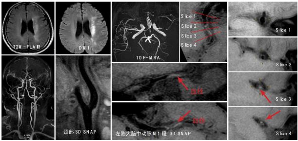 | 高分辨血管壁成像技术清晰显示椎动脉及基底动脉粥样硬化并斑块形成至管腔狭窄 | 磁共振高分辨血管壁成像技术显示左侧大脑中动脉 M1 段内血栓致左侧大脑梗塞 |
